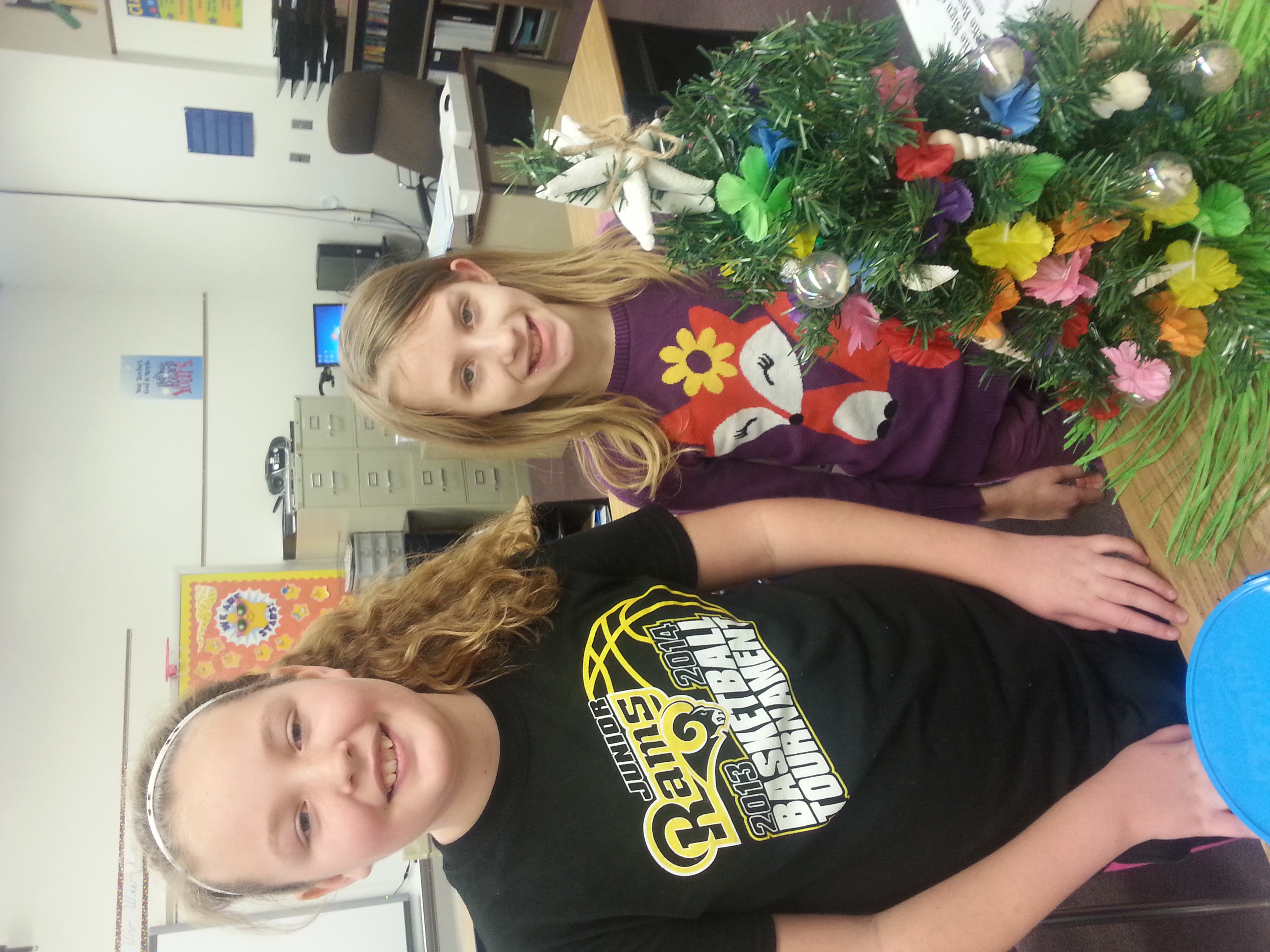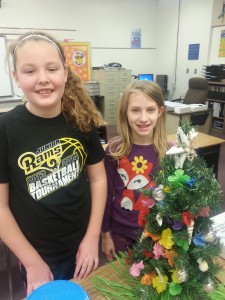 I went to Lily’s school to help her decorate a Christmas tree for the 5th grade festival of trees.   Here are Sarah and Lily and their Hawaiian tree!