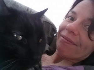 I see 2 big eyes, 2 ears standing up and black everywhere. And that is just you, Jeni..Luna looks adorable too.